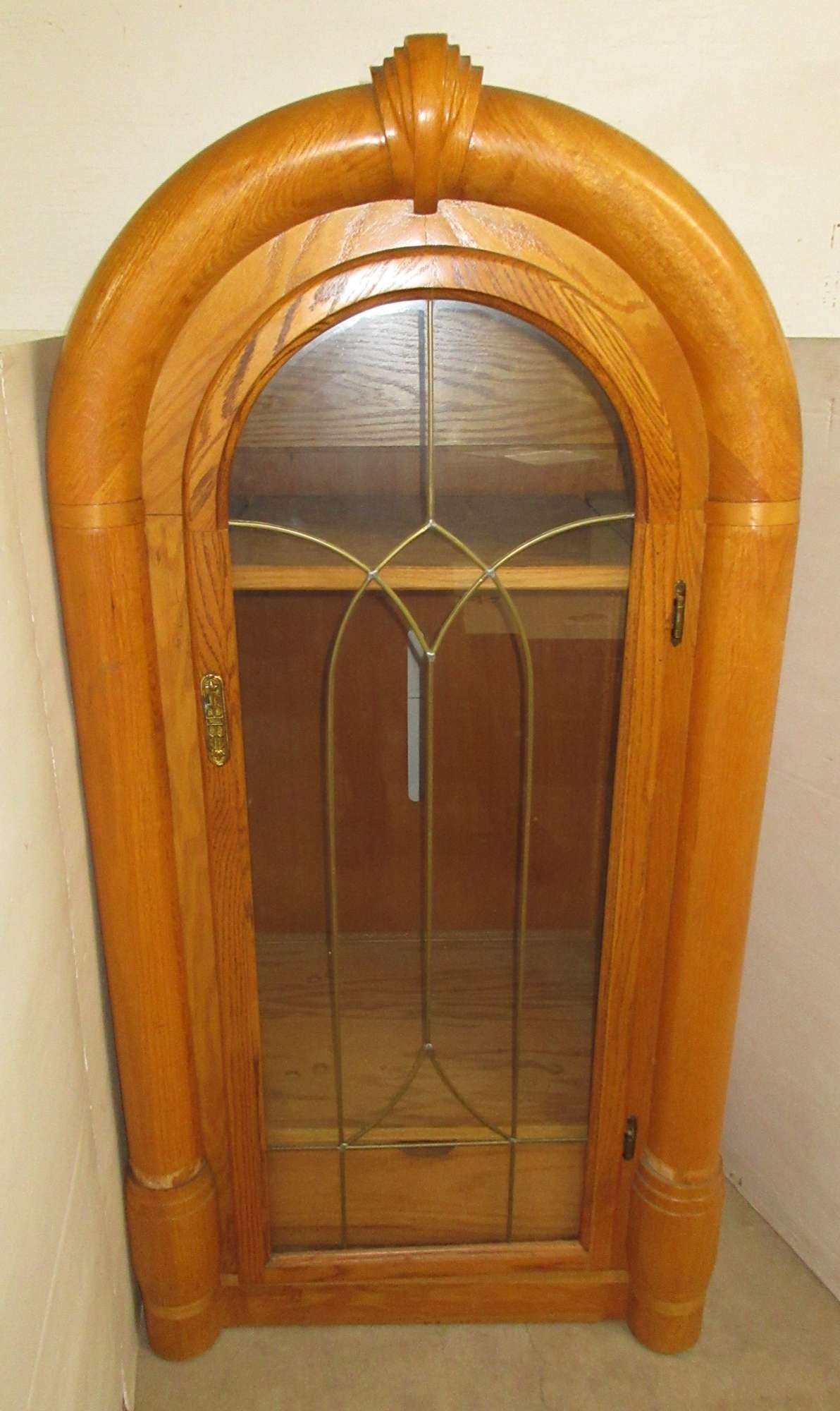 The cabinet has bead board detailing and one glass panel door.